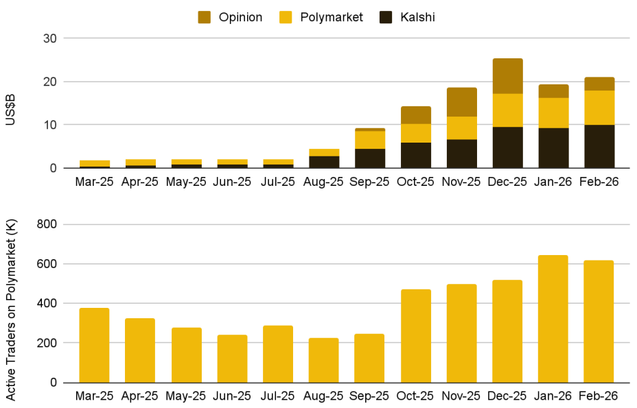 예측시장 거래량은 12월 고점인 약 250억 달러에서 2월 약 210억 달러로 다소 완화됐지만, 크립토 시장 전반의 하락폭과 비교하면 상당히 견조한 수준을 유지했습니다. Polymarket과 Kalshi가 합산 약 180억 달러 규모의 명목 거래량으로 가장 큰 점유율을 차지하고 있으며, Opinion도 출시 이후 꾸준히 존재감을 확대하고 있습니다. Polymarket의 활성 트레이더 수는 약 60만 명 수준에서 안정화됐고, 이는 2025년 중반 대비 거의 3배에 해당합니다.