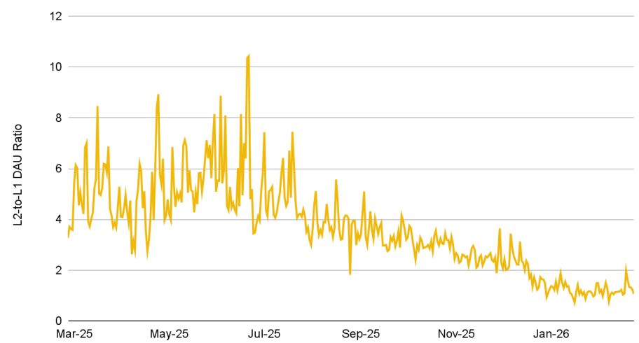 L2 대 L1 일간 활성 사용자 비율은 2025년 6월 10.43으로 정점을 기록했으며, 당시 Base가 360만 DAU를 기록한 것이 큰 영향을 미쳤습니다. 그러나 8개월 뒤인 2026년 2월 이 비율은 1.12까지 급감했습니다. 이는 전년 대비 68% 감소입니다.