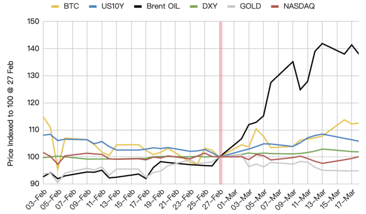 - 2026년 2월 23일부터 3월 18일까지 호르무즈 해협에서 공급 차질이 발생하면서 브렌트유는 +46% 급등했습니다. 같은 기간 BTC는 +15% 상승해 나스닥(+1%)과 금(−3%)을 모두 상회했습니다. 반응은 세 단계로 분명히 구분되었습니다. 초기의 짧은 약세(1~3일차) → 박스권 내 흡수(4~14일차) → 독립적 랠리(15~24일차)입니다.