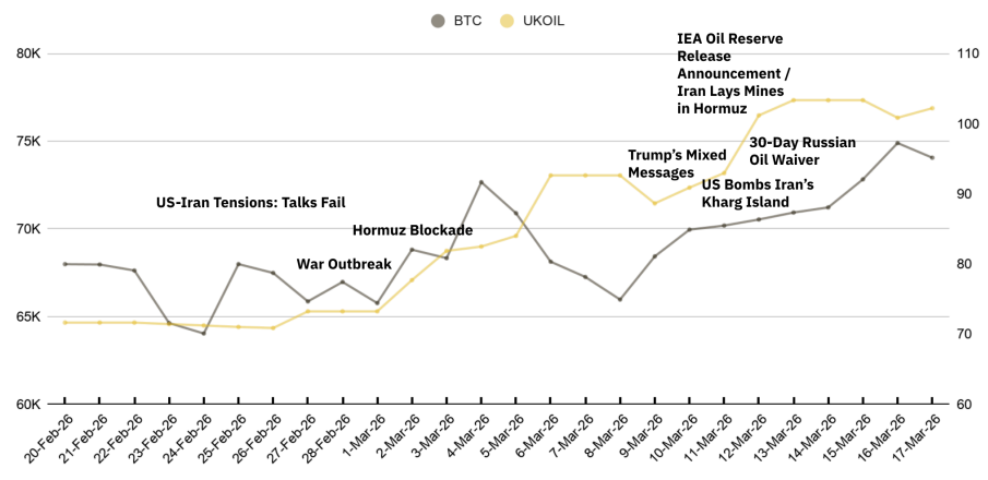 3월 9일부터 BTC와 유가는 분명하게 갈라졌습니다. 유가는 104달러를 향해 계속 상승했지만, BTC는 66,000달러에서 75,000달러로 상승했습니다. 9거래일 동안 +15% 상승한 셈입니다. 3월 18일 기준 BTC는 위기 장중 저점 대비 +18.8%, 위기 이전 주 대비 +15%를 회복했습니다.
