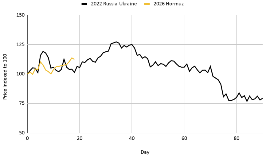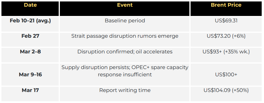 호르무즈 해협은 전 세계 해상 원유 거래량의 약 20%를 처리합니다. 2026년 2월 말 이 수로의 안보 상황이 급격히 악화되자, 브렌트유 가격은 3주도 되지 않아 배럴당 69달러에서 104달러를 넘는 수준까지 급등했습니다. 이는 +50%에 달하는 충격으로, 현대사에서 가장 큰 단기 유가 왜곡 중 하나에 속합니다.
