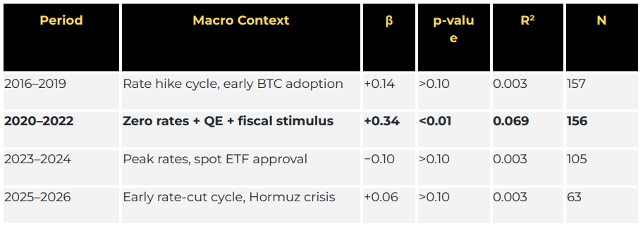 - 2016년부터 2026년까지 10년치 주간 데이터(N=532)와 엄밀한 계량경제학적 방법론(DCC-GARCH, 롤링 윈도우 회귀분석, 그랜저 인과성 검정)을 활용한 결과, BTC와 원유 수익률은 통계적으로 독립적인 과정인 것으로 나타났습니다. 유의미한 양(+)의 상관관계(β=0.34, R²=0.069)는 전례 없는 통화 완화가 있었던 2020~2022년 기간에만 존재했으며, 이는 직접적인 인과관계라기보다 공통의 유동성 요인으로 설명하는 것이 가장 적절합니다. 그 외 모든 하위 기간에서는 상관계수가 0과 구분되지 않았습니다.