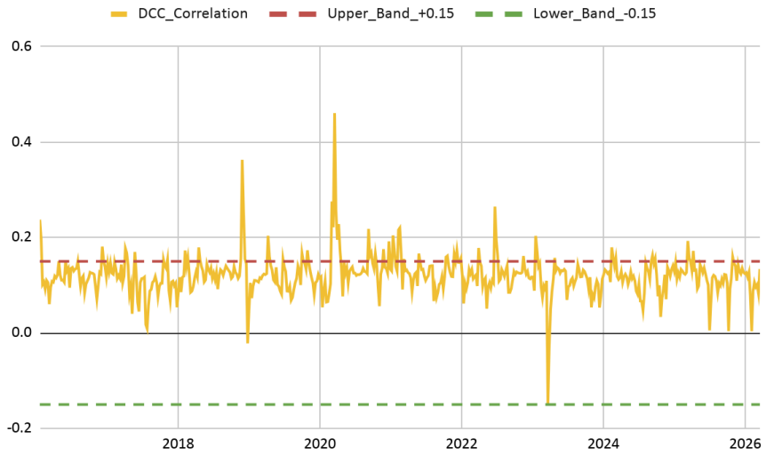 DCC 모형은 하위 기간 평균이 가리는 그림을 보여줍니다. 표본의 대부분에 해당하는 기준 상태에서는 조건부 상관관계가 낮고 경제적으로도 거의 의미가 없습니다. 평균은 대략 +0.10~+0.12이며, 지속적 방향성도 없습니다.