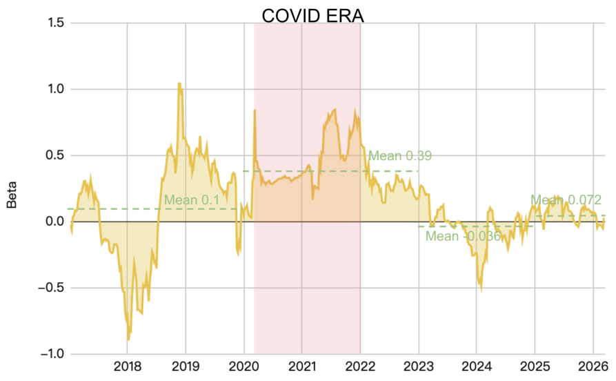 유일한 지속적 이탈은 2020년 3월부터 2021년 말까지입니다. 이 시기 상관계수 ρ는 기준선보다 유의미하게 상승해 주간 기준 +0.40을 넘는 수준까지 갔고, 평균도 +0.14 수준이었습니다. 이는 “모든 자산이 함께 오르는” 무제한 유동성 국면을 반영합니다.