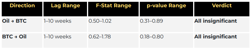 이처럼 제약 없는 글로벌 유동성 환경에서는 주식, 크립토, 원자재, 부동산 등 거의 모든 위험자산이 동시에 상승했습니다. BTC와 유가는 직접 인과관계가 아니라 공통의 동인인 글로벌 유동성 요인을 공유했던 것입니다. 이를 보여주는 결정적인 통계적 증거는 2020~2022년에도 Oil→BTC 그랜저 인과성 검정이 비유의적이었다는 사실입니다(1시차 p=0.30). 선행-후행 예측력 없이 동조화만 나타나는 것은 직접 인과관계가 아니라 공통 요인의 전형적인 특징입니다.