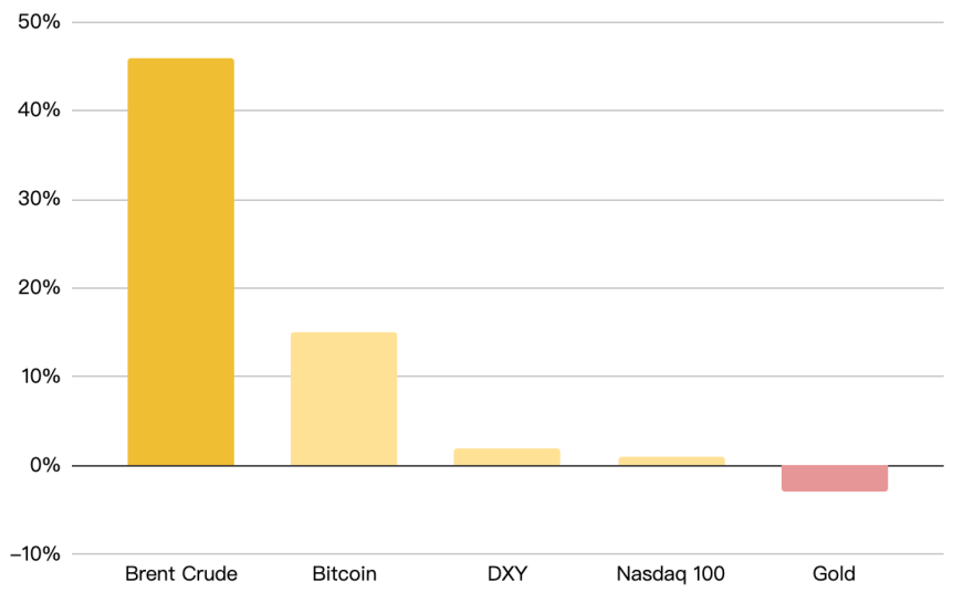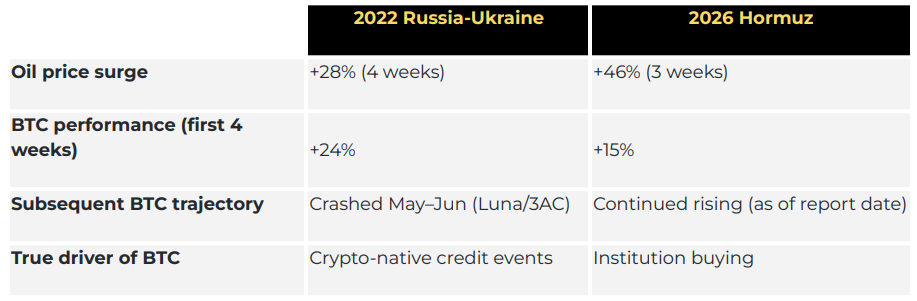 둘째, 호르무즈 위기는 BTC의 독립적인 가격 형성 능력을 확인시켜 주었습니다. 유가가 +46% 급등하는 동안 BTC는 +15% 상승하며 금과 나스닥을 모두 상회했습니다. ETF 순유입, 양(+)으로 전환된 코인베이스 프리미엄, 지속적인 기업 재무 보유 축적이라는 세 가지 독립적 증거는 위기 동안 기관 자본이 역주기적 자산 배분 전략을 실행했음을 보여줍니다.