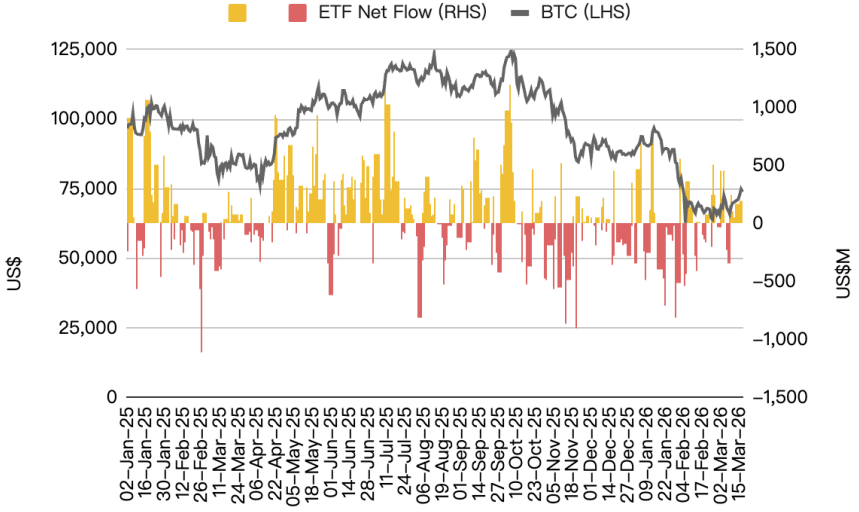 3월 9일부터 17일까지는 7거래일 연속 순유입이 발생했고, 일평균 +1억6,600만 달러, 총 +11억6천만 달러를 기록했습니다. 이 자금 흐름 패턴은 BTC가 66,000달러에서 75,000달러로 랠리한 시기와 정확히 일치합니다.