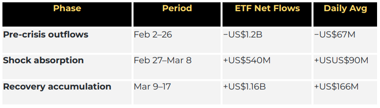 3월 6일, 유가가 장중 93달러까지 급등했을 때 ETF는 위기 기간 중 가장 큰 단일 일자 순유출(−3억4,900만 달러)을 기록했습니다. 그러나 이 짧은 투매는 다음 거래일 곧바로 자금 회복으로 이어졌습니다.