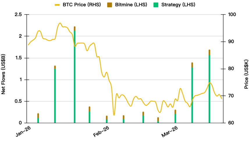 - 위기 기간인 3월 2일부터 17일까지 현물 BTC ETF 순유입은 총 +17억 달러에 달했습니다. 코인베이스 프리미엄은 3월 초 양(+)으로 전환되었고, 기업 재무 보유 목적의 매수도 위기 내내 지속되었습니다. ETF 자금 유입, 미국 현물시장 매수, 기업 축적이라는 세 가지 독립적 수요 채널이 거시 충격을 흡수하고 이후 랠리를 이끌었습니다.